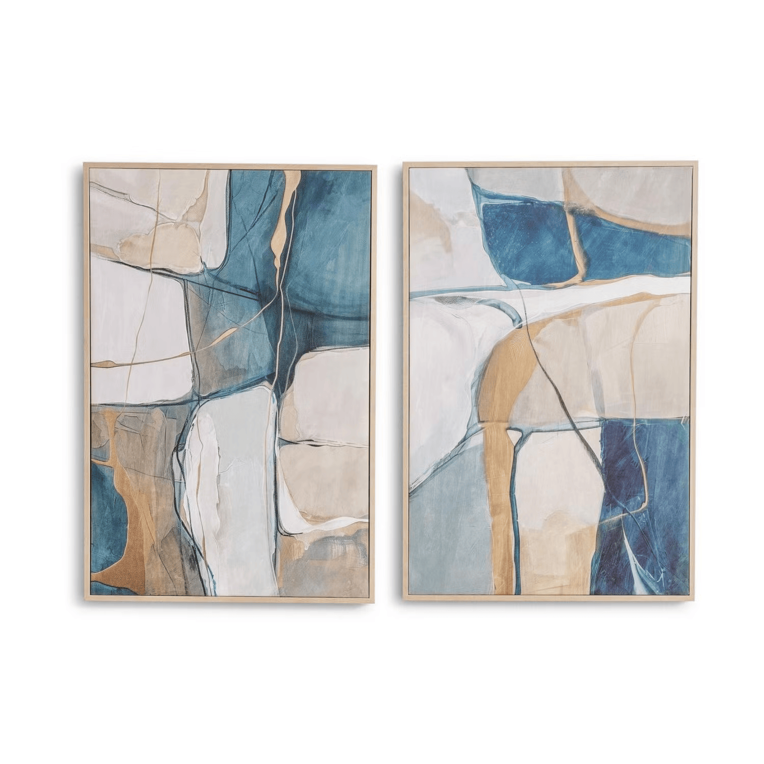 Elevate your home décor with this set of 2 abstract framed canvas wall art in shades of blue, beige, and white. Digitally printed on fine canvas fabric and framed with durable MDF, each piece adds a modern yet calming touch to your walls. Compact and lightweight, they are easy to hang above a console, sofa, or in narrow spaces. Low maintenance and wipe-clean design for everyday practicality.
